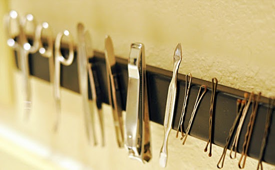 Uma simples fitinha magnética colada no seu espelho do banheiro vai facilitar muito manter seus pequenos utensílios metálicos.