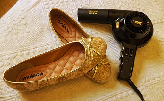 Basta colocar uma meia grossa e (talvez com muito esforço) vestir seus sapatos, depois é só passar o secador na partes apertadas. Se for necessário, você pode repetir o processo para lacear ainda mais.