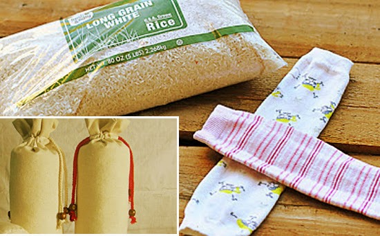 Sabe aquelas bolsas nada práticas, que sempre correm o risco de estourar e molhar você e sua cama inteira? Pois então: Uma meia cheias de arroz aquecido é muito mais prática e segura, e ainda por cima você evita um vazamento de água que pode te fazer acordar achando que está se afogando!